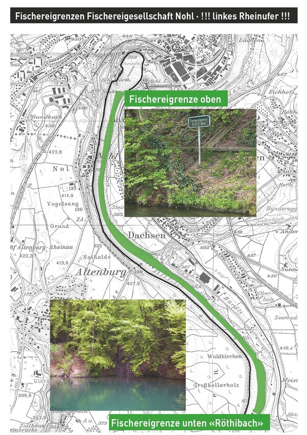 Linkes Rheinufer bis Rheinmitte ab spezieller Grenztafel (etwa 200 Meter unterhalb Rheinfall) mit der Aufschrift «Fischereigrenze Kanton Schaffhausen/Fischereigesellschaft Nohl» bis «Metteli» (Röthenbach, etwa 4 km).