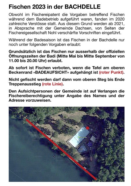 - Während der Badesaison ist das Fischen in der Bachdelle nur noch gemäss separatem Beiblatt «Fischen in der Bachdelle» erlaubt.